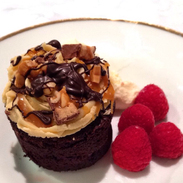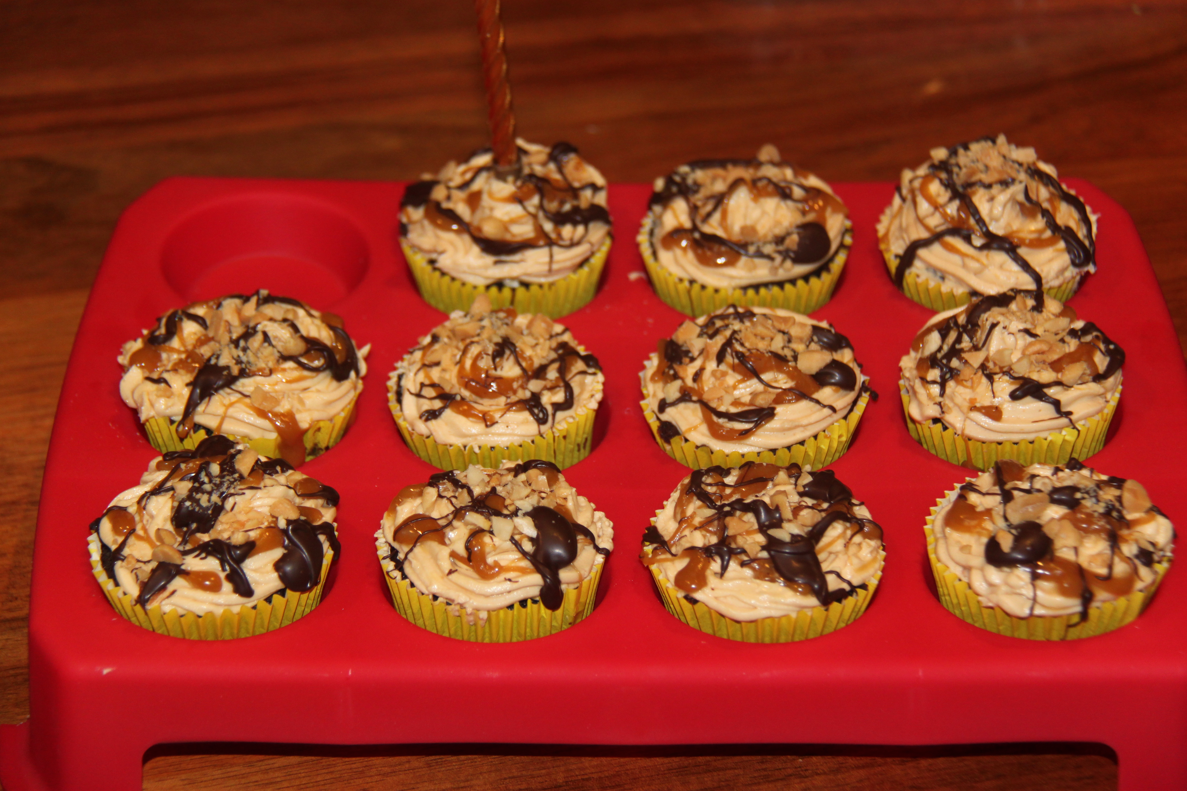 Using a piping bag with a star attachment, pipe the frosting in a circular motion onto the cupcakes, starting around the edge so that you form a soft-serve ice-cream effect. Drizzle with remaining caramel sauce, melted dark chocolate and then top with salted peanuts & chopped snickers. Enjoy!