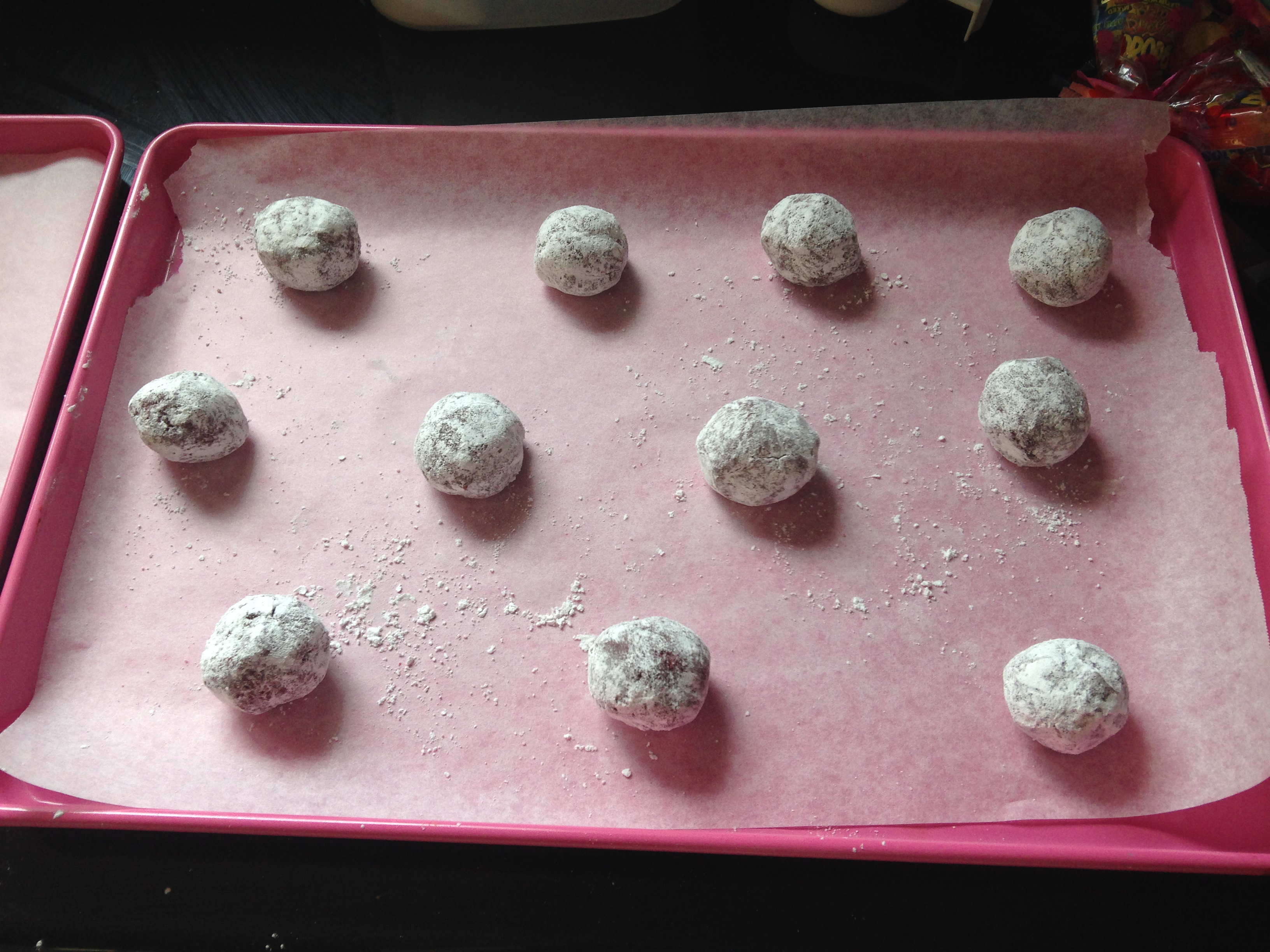 Preheat oven to 160°C fan-forced. Roll dessert spoons of the dough into the white sugar, shape them gently into balls and then toss in icing sugar. Place them on lined baking trays allowing plenty of room for spreading.