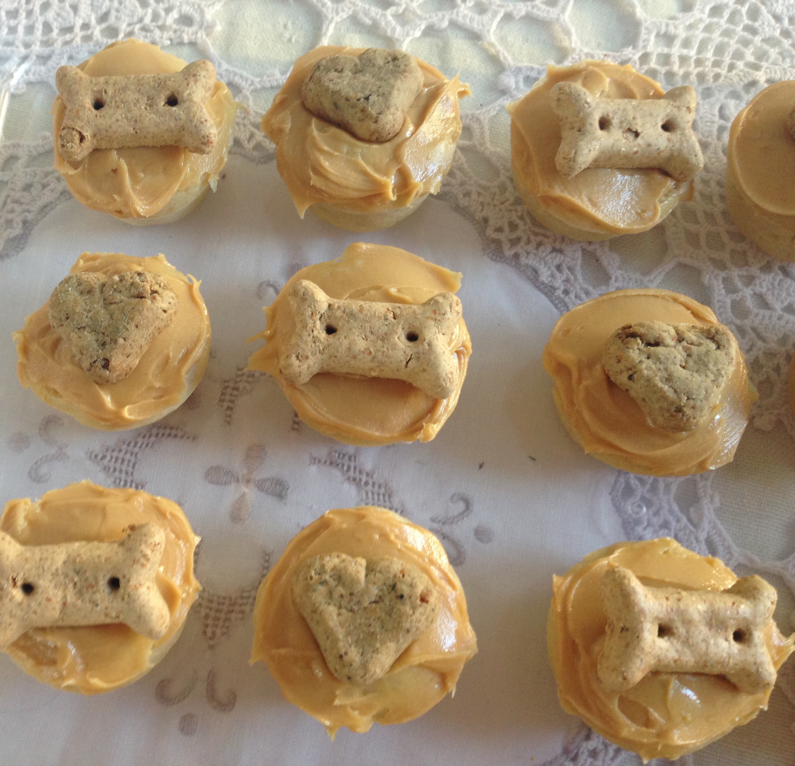 Once cool, “ice” with a thin layer of smooth peanut butter and top with a dog biscuit.