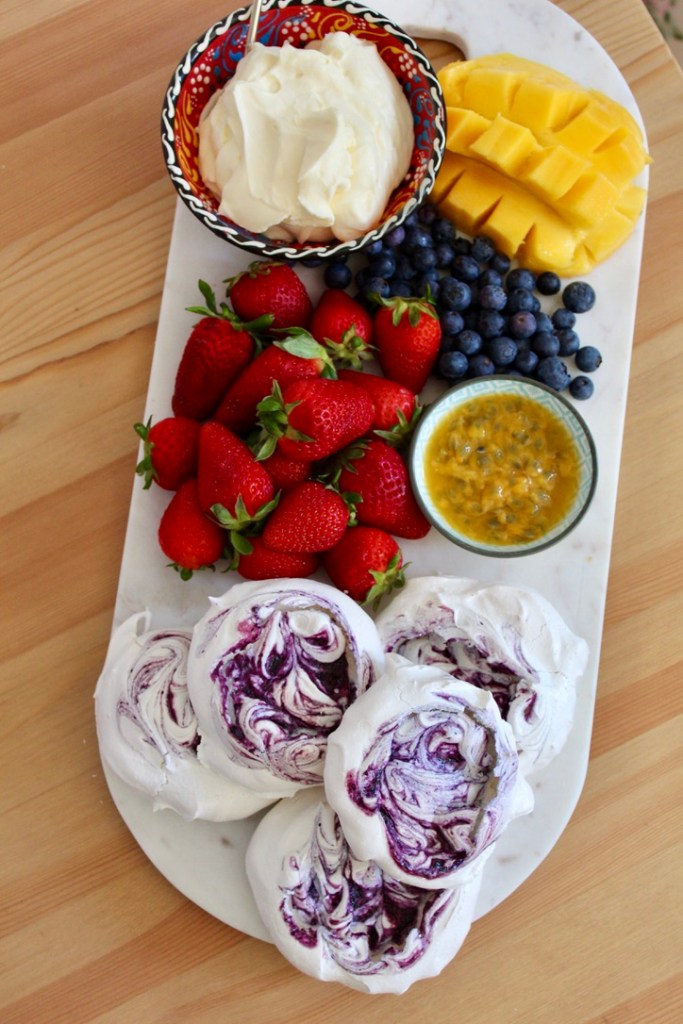 These meringues have just the right level of chewiness and a subtle hint of blueberry flavour. I served them like mini pavlovas topped with whipped sweetened cream and fruit, but they’re also delicious on their own.