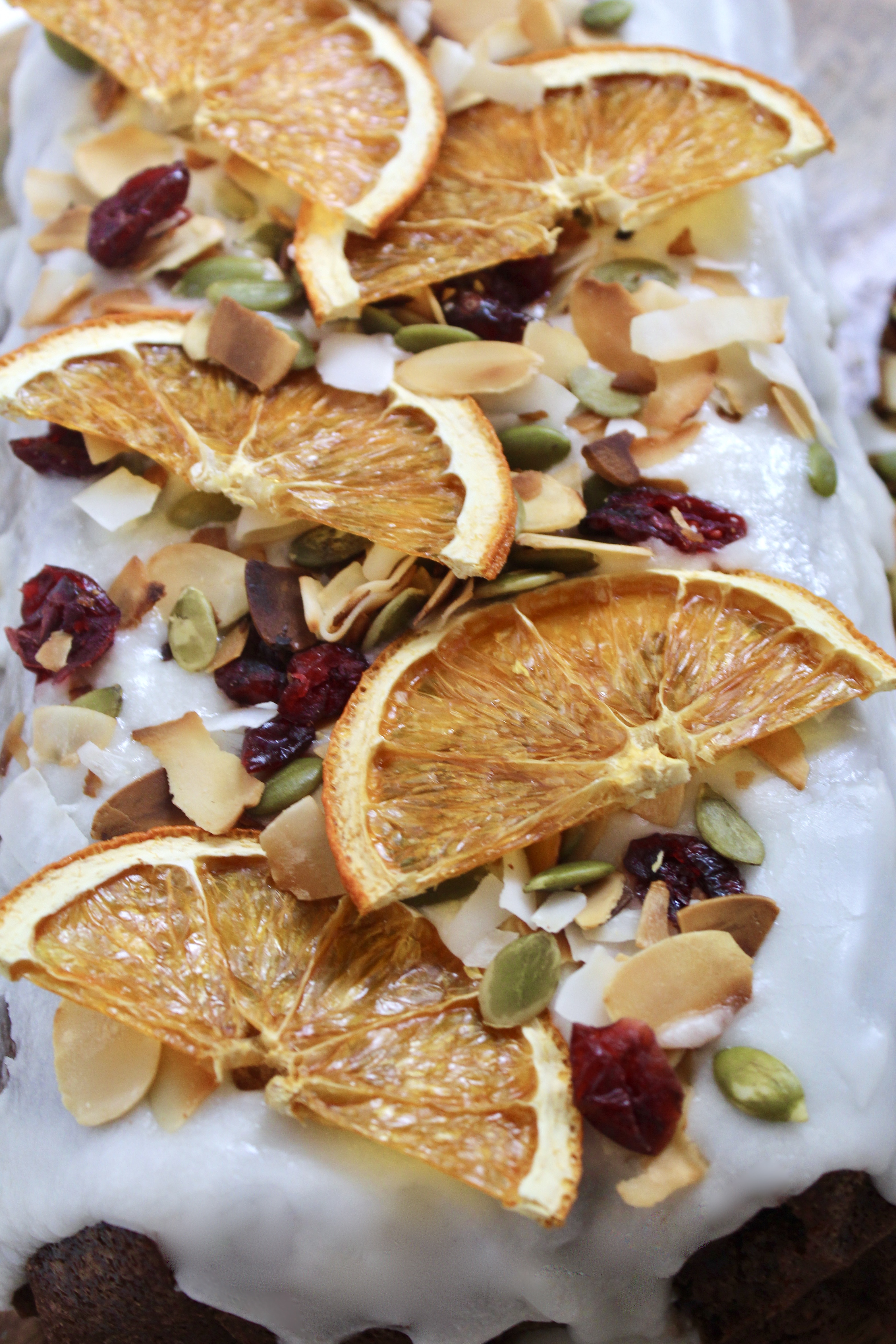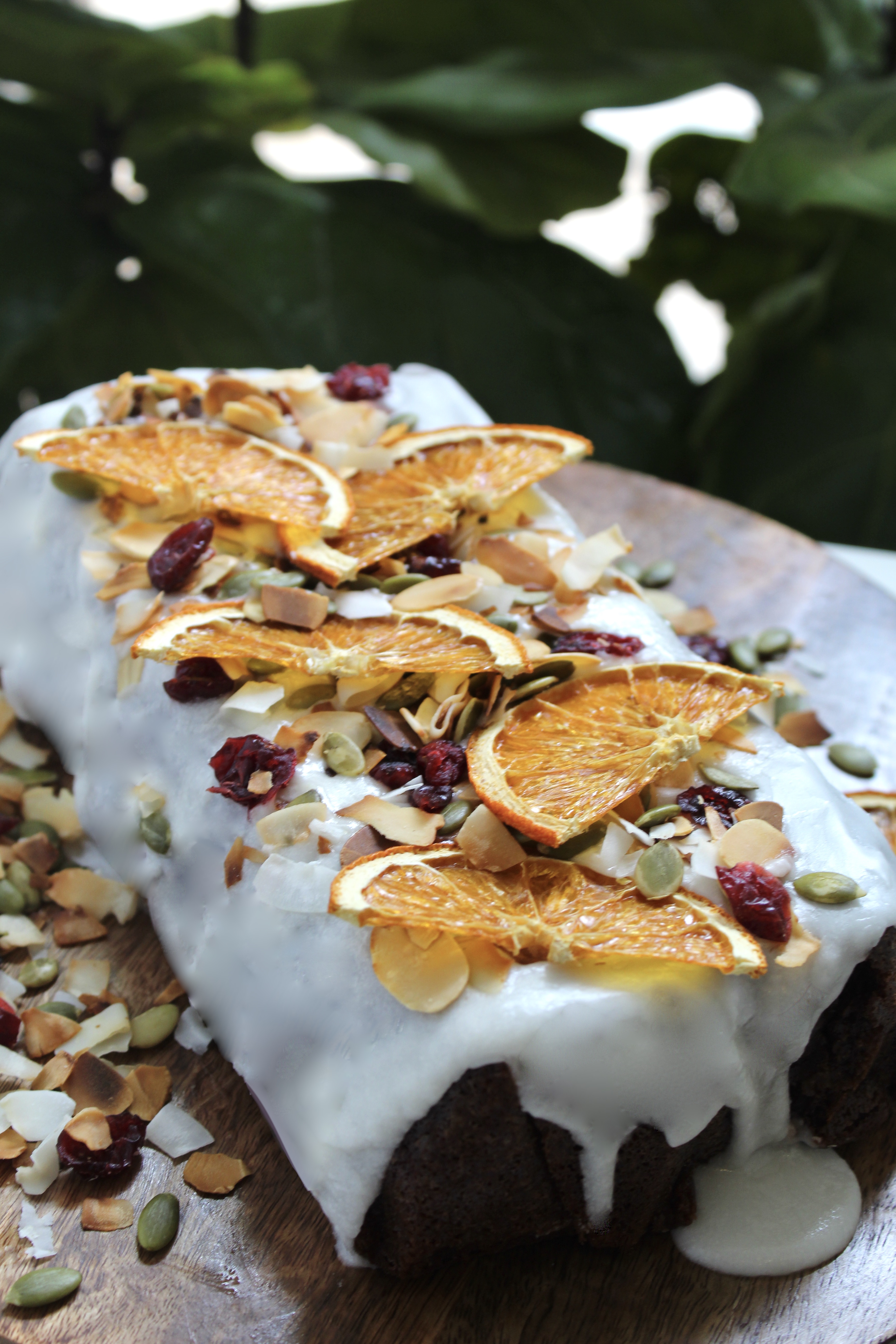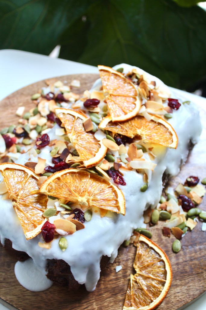 To make the icing, combine vanilla icing sugar and 1½ – 2 tablespoons of hot water. Leave it to thicken slightly before pouring on the cake. Decorate with orange pieces, cranberries, pepitas, shaved coconut and flaked almonds. Enjoy!