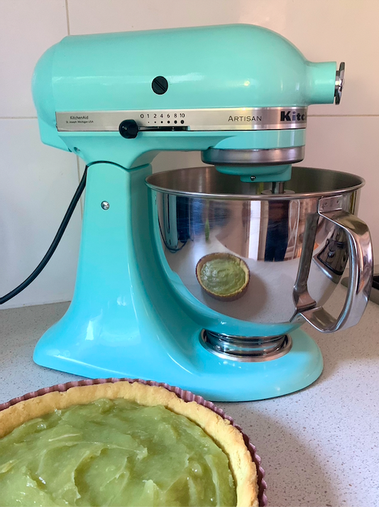 In order to christen it properly, I knew I had to make something with meringue to take advantage of not having to hold beaters while the eggwhites are whipping. Mum’s lime tree is absolutely chokkas at the moment, so a lime meringue pie was the obvious choice.