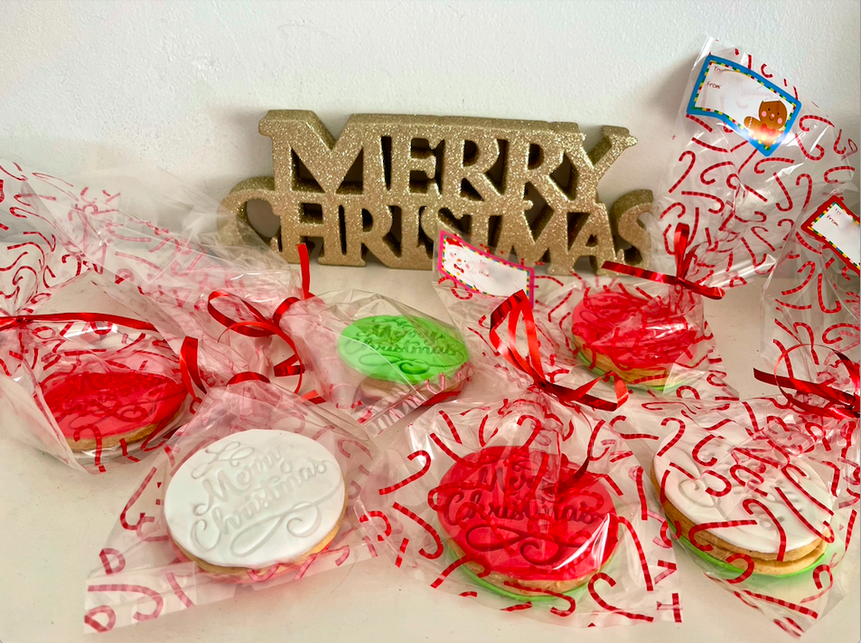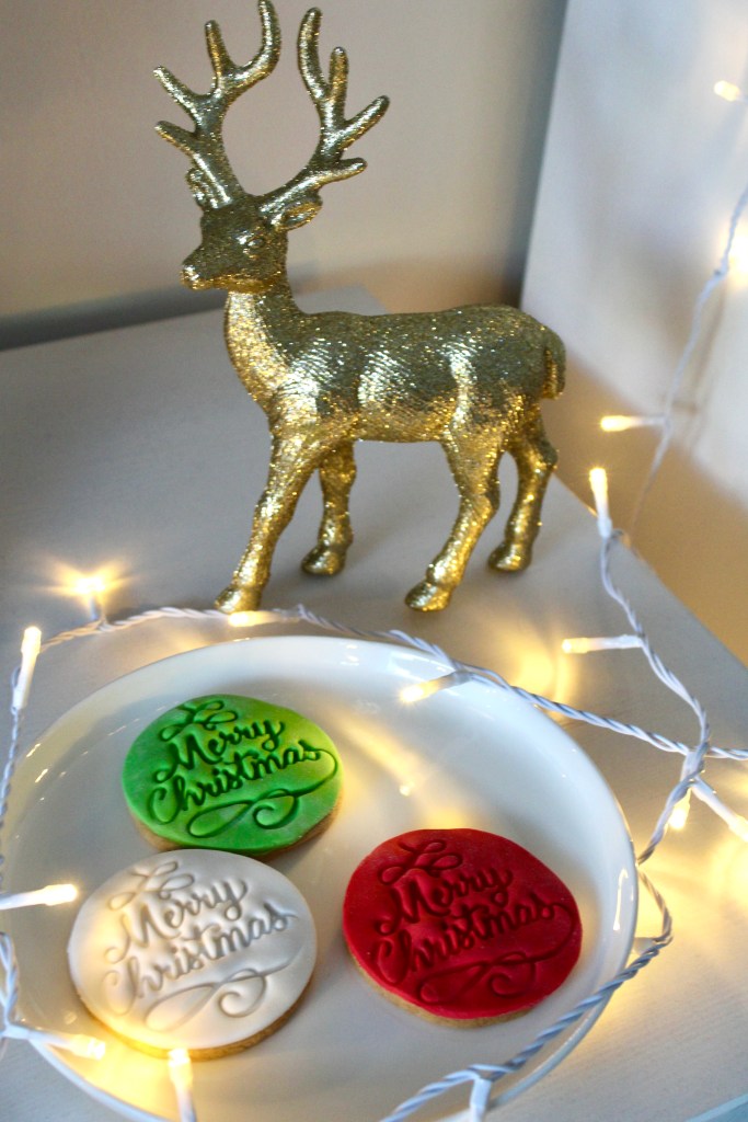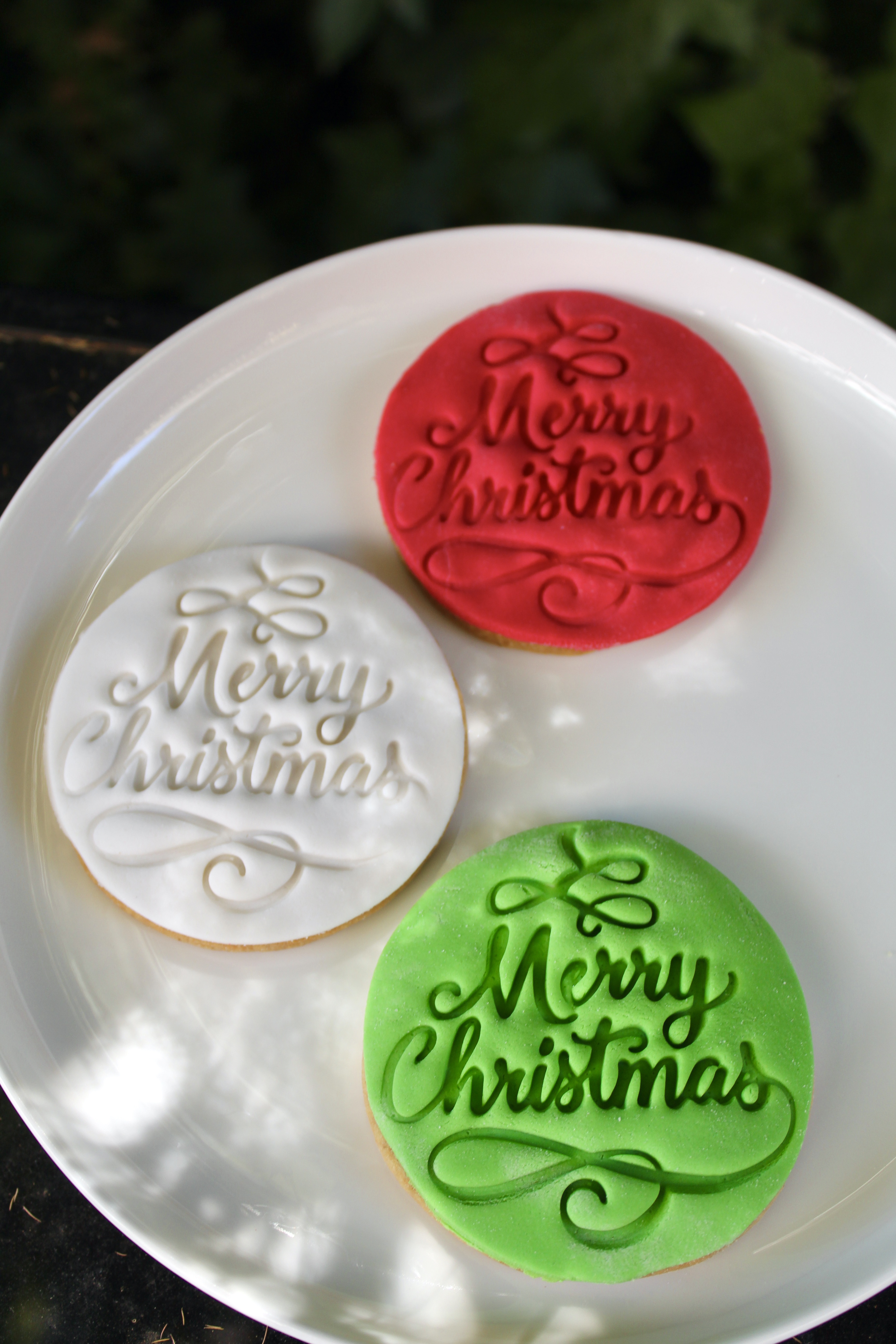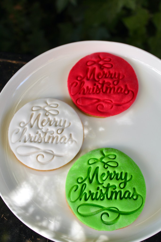 Brush each cookie with a small amount of the vanilla glaze and the top with fondant. Press down gently to ensure the fondant has adhered completely to the cookie. Stamp with a ‘Merry Christmas’ cookie stamp or decorate as desired. Repeat until all cookies have been decorated. Enjoy!