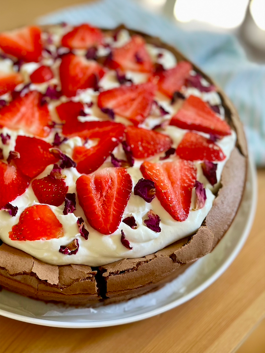 Top with the whipped cream, berries and rose petals. Enjoy!