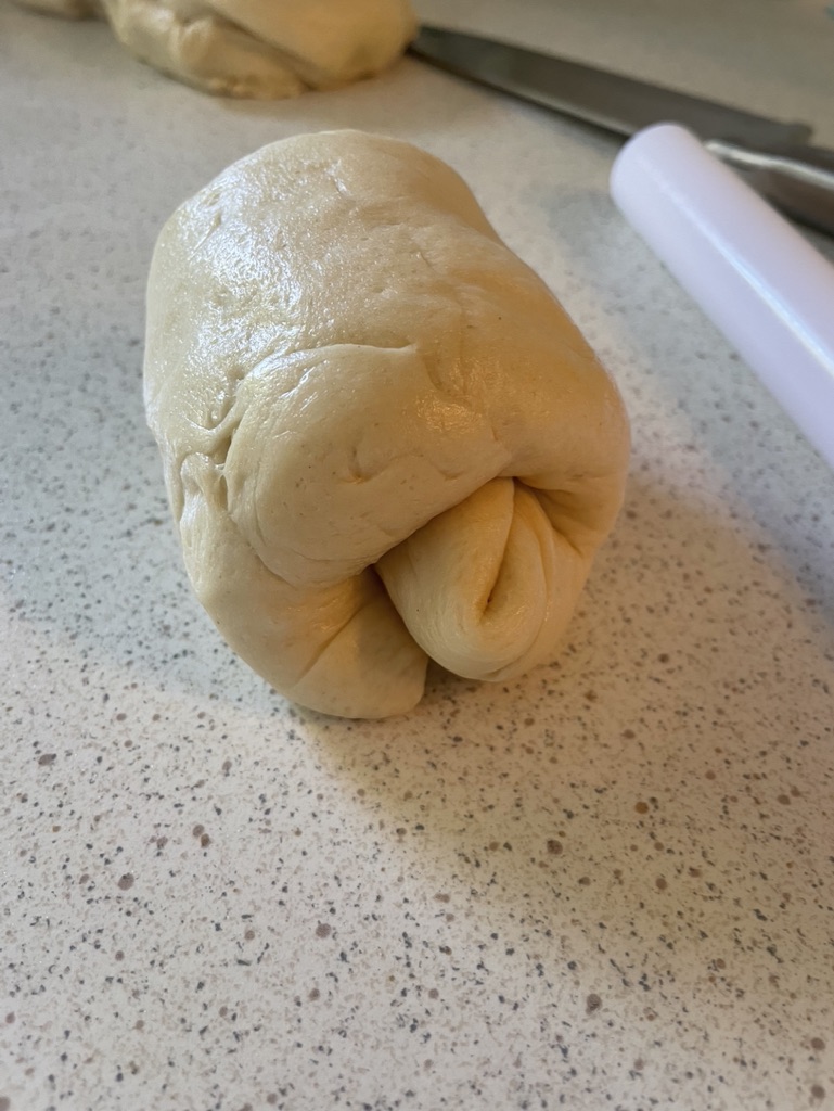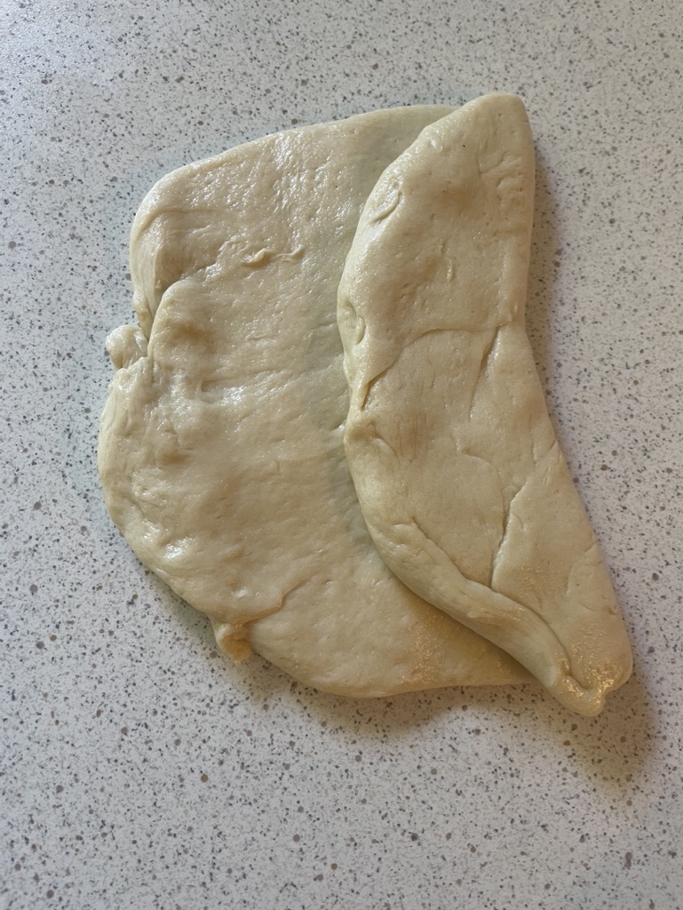 Once it has risen, punch down the dough and divide into three equal pieces. Set the other pieces to one side and use a rolling pin to shape a piece into an oval shape.