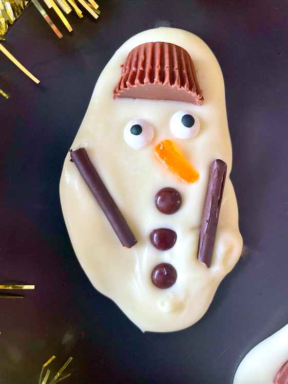 Working quickly and using the picture as a guide, arrange the peanut butter cup ‘hat’, 2 eyeballs, jube nose, 3 M&M buttons and pocky stick arms on each puddle.