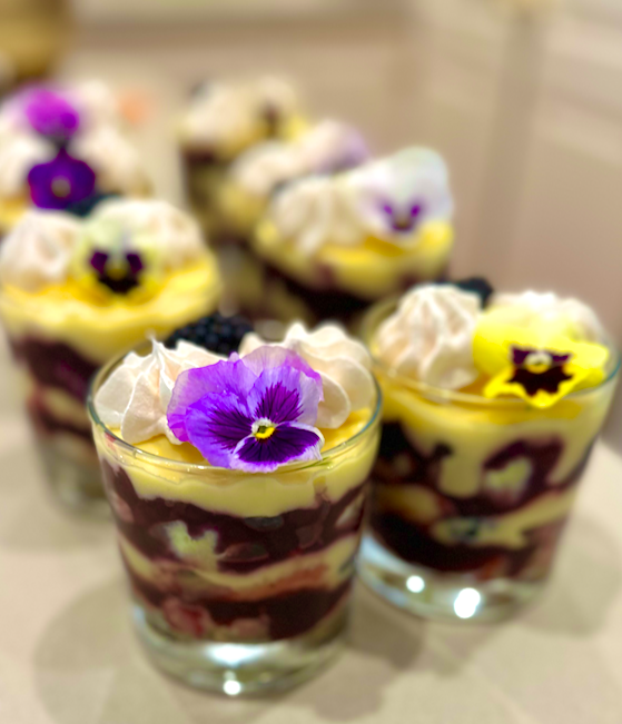 Repeat the layers – sponge cake, blackberry jam, custard and curd. Then top with a few whole meringues, a couple of blackberries and an edible flower. If not serving immediately, leave off the meringues from the top until just before serving so they stay crisp.