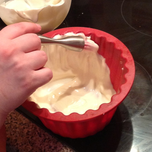 Fill the giant cupcake pans, starting with the cupcake top. Fill until approximately 2cm shy of the top of the pan. Then fill the bottom pan with the remaining batter.
