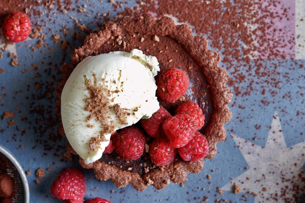 Cool tarts completely. When ready to serve, remove the tarts from their cases, top with cocoa powder and raspberries and serve with vanilla ice cream or cream.