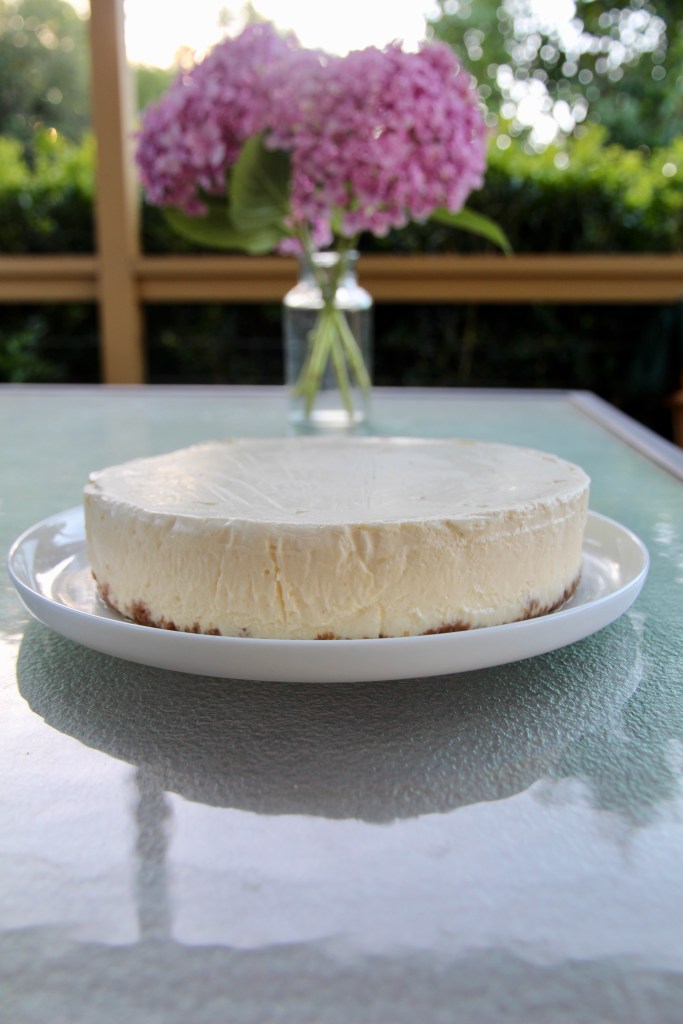 The next day, cover a flat plate or board with clingfilm. Gently remove the paper from the side of the tin (this should loosen the cheesecake) and place the prepared plate/board on top of the cheesecake. Flip the cheesecake over quickly and place the plate on the work surface. Tap the base of the tin and lift a side of the tin – with a wiggle the cheesecake should release. Peel off the baking paper and invert again onto a serving plate so it is top-side up.